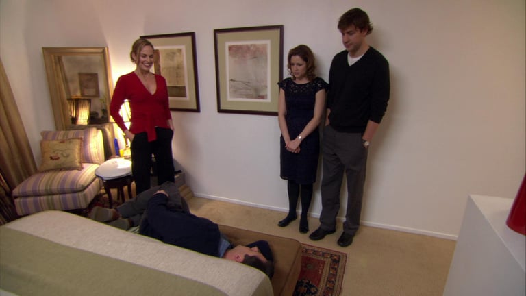 É nesse cenário apertado que entram, um a um, os convidados: Jim e Pam, o casal aparentemente equilibrado; Andy e Angela, um par disfuncional por definição; e, mais tarde, Dwight, que chega sem convite, acompanhado da sua ex-babysitter como “namorada de ocasião”. Este desfile de figuras é o combustível de uma noite explosiva, onde o que está em jogo não é apenas uma refeição, mas a imagem que Michael tenta desesperadamente preservar da sua vida pessoal.